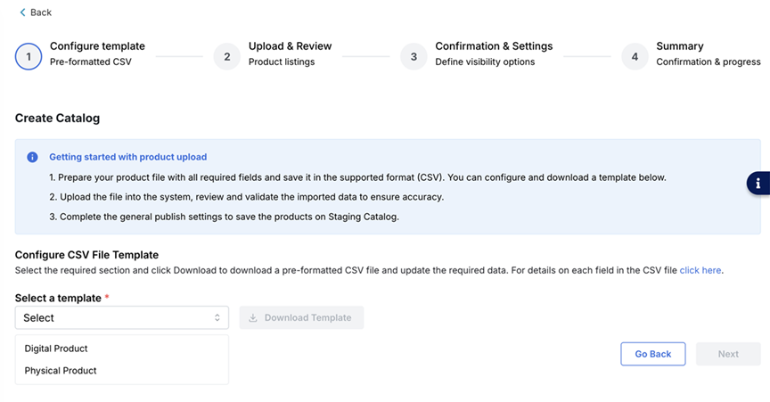 - Click Download Template to download the selected product template CSV file that you can use to add your product information.