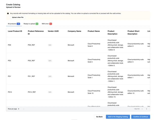 - After you verify your data, choose if catalogs needs to be published or added to staging. In the Upload & Review step select one of the following: