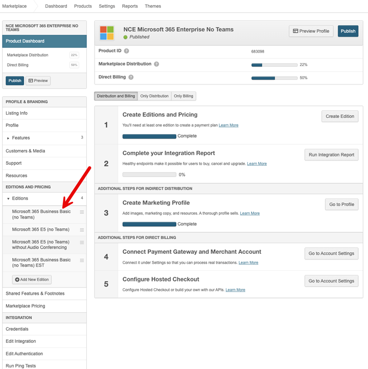 - Save and Preview to save your edits and display the Editions & Pricing tab of the product's profile. You can perform additional edits from the profile page by clicking Edit Profile and using the page's graphical interface.