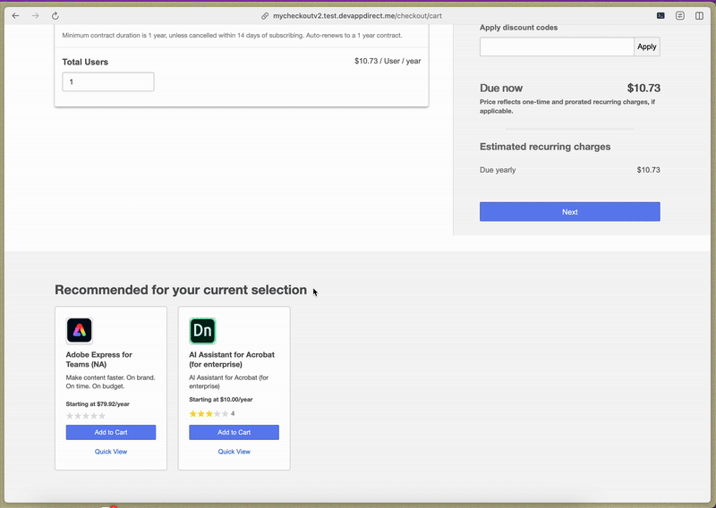 When a user adds an Adobe product to the cart, relevant recommendations from Adobe are displayed on the cart page. Customers can easily add any of these suggested items to their cart if they find them relevant.