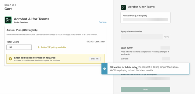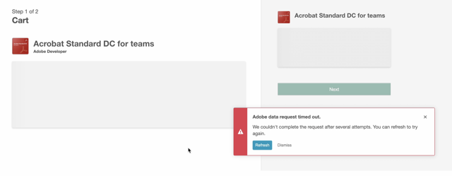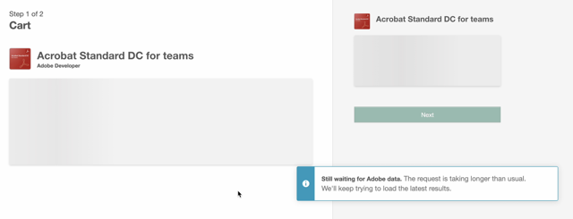 AppDirect introduces new notifications to improve the user experience when creating quotes or completing checkout for Adobe products. This improvement ensures you remain informed and avoid unnecessary cart failures when latency from Adobe occurs.