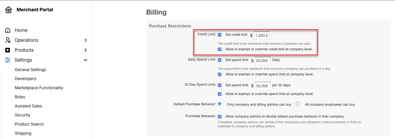 • Marketplace control and overrides: A new setting allows you to turn the Credit Limit feature on or off. You can establish a global default limit via Settings > Billing Functionality or apply company-specific overrides, including granting Unlimited Credit to trusted partners.