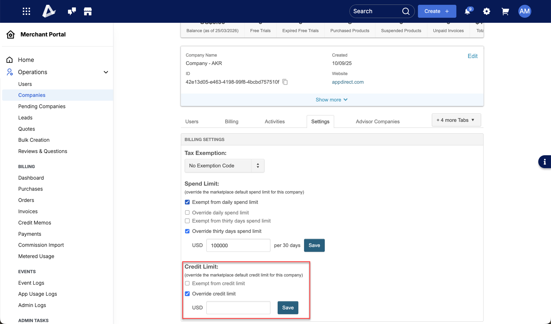 • Company-specific overrides: Account Managers can navigate to an individual company's settings to increase, decrease, or completely override limits for that specific account.