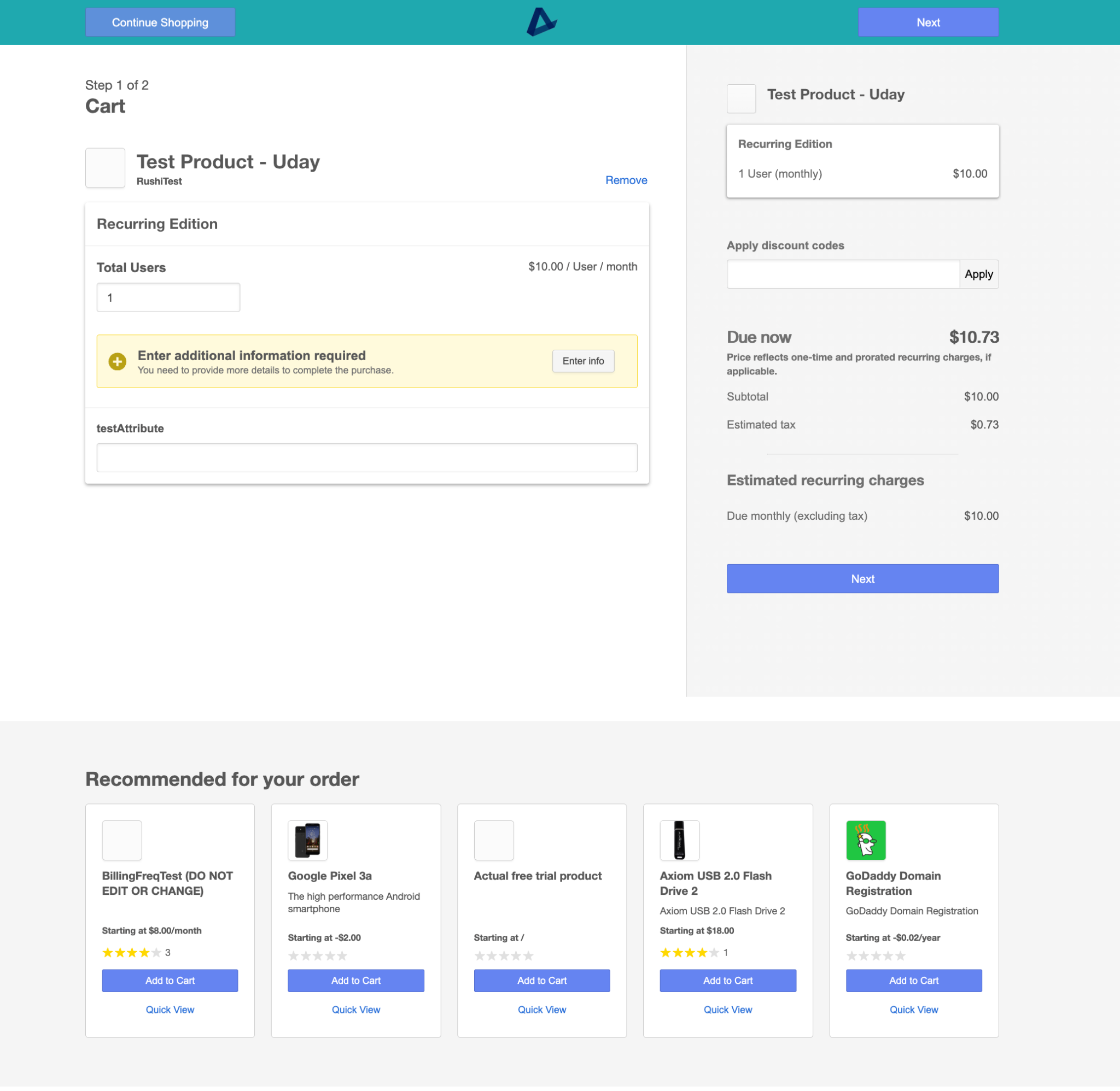 In Checkout V2, buyers now see a Recommended for your order section in the cart when they add supported SaaS products. This adds product discovery directly in the purchase flow so buyers can evaluate and add complementary products without leaving checkout.