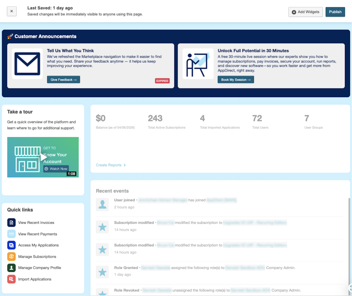 The updated design brings a familiar and cohesive experience to the Company Admin dashboard. Customization allows the dashboard to now focus on what is more relevant for day-to-day work, and key metrics like active subscriptions and account balance are available at a glance for faster decision-making.