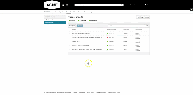 Marketplace Managers can retry distributor product imports that did not complete successfully. From the distributor catalog Product Imports page, where import and sync status is shown, users can trigger a new import attempt without starting the full selection flow again. This reduces manual rework when transient errors or incomplete runs occur and helps bring products into the staging catalog faster.
