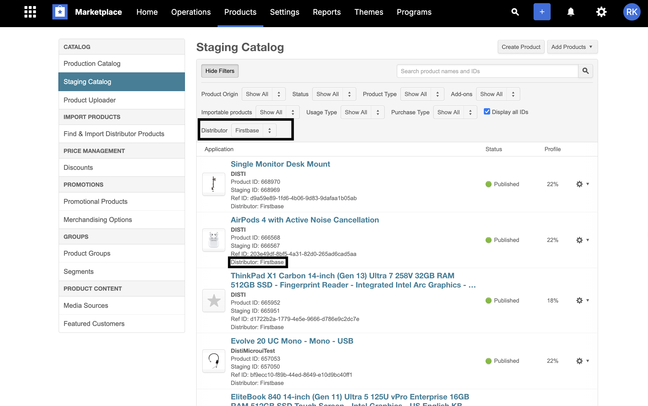 The Staging Catalog and other relevant product views now make it clear which items are distributor-sourced versus products added through other paths. We have added a new Distributor label for every distributor product and an option to filter products by distributor source (examples: TD SYNNEX, Ingram Micro, Firstbase).