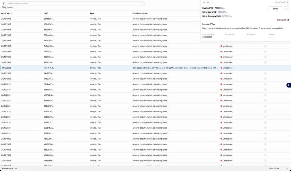 The dashboard provides real-time visibility into platform failures and ability to retry and manually trigger the invoice processing again from the dashboard UI.