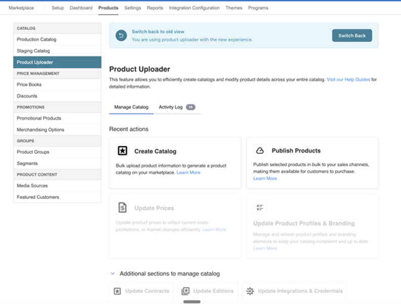 The Product Uploader UI is enhanced to allow the users to try the new functionalities for specific tasks while switching back to the existing UI whenever necessary.