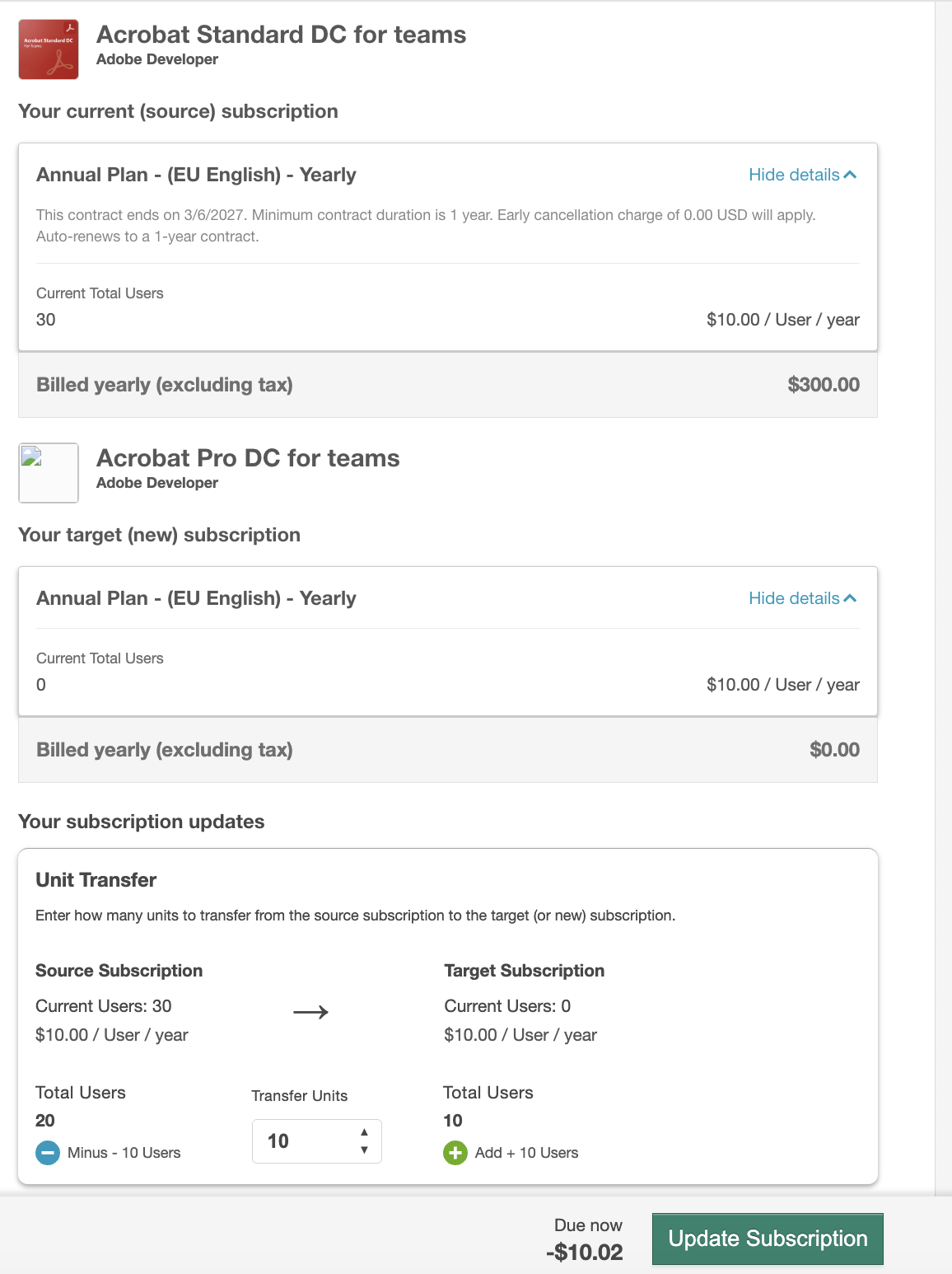 | Partial Transfer | Transfer a subset of licenses from an existing subscription to another subscription (existing or new higher-tier). Both subscriptions remain active. |
