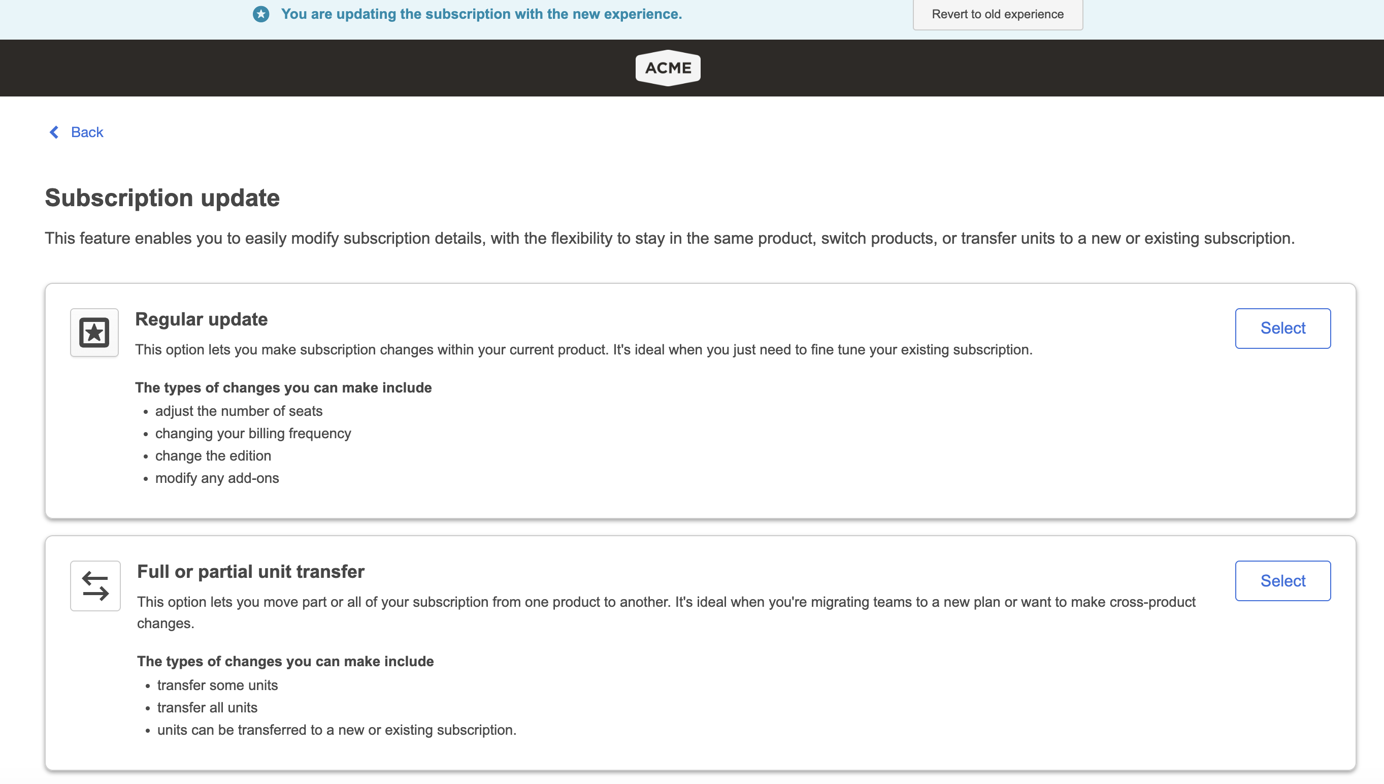 - Navigate to the Update V2 flow. Sales agents and end customers can choose Regular or Mid-term upgrade.