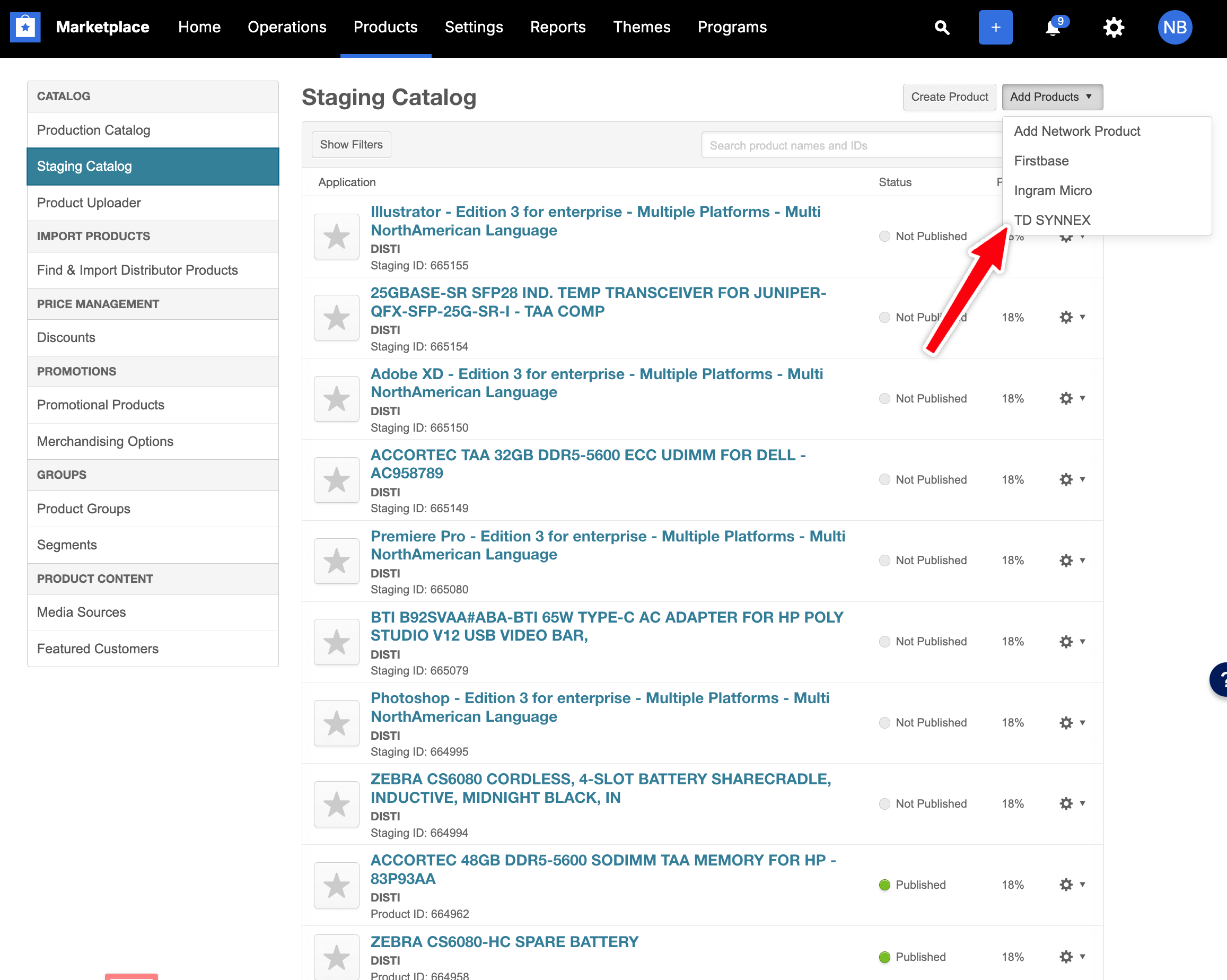 This path keeps product import aligned with the standard Staging Catalog experience. You do not need to open the separate distributor product listing page to start an import.
