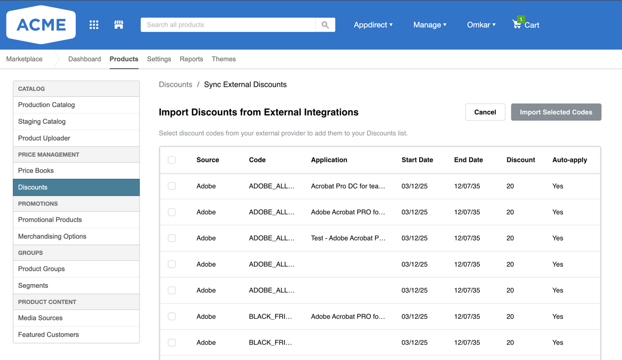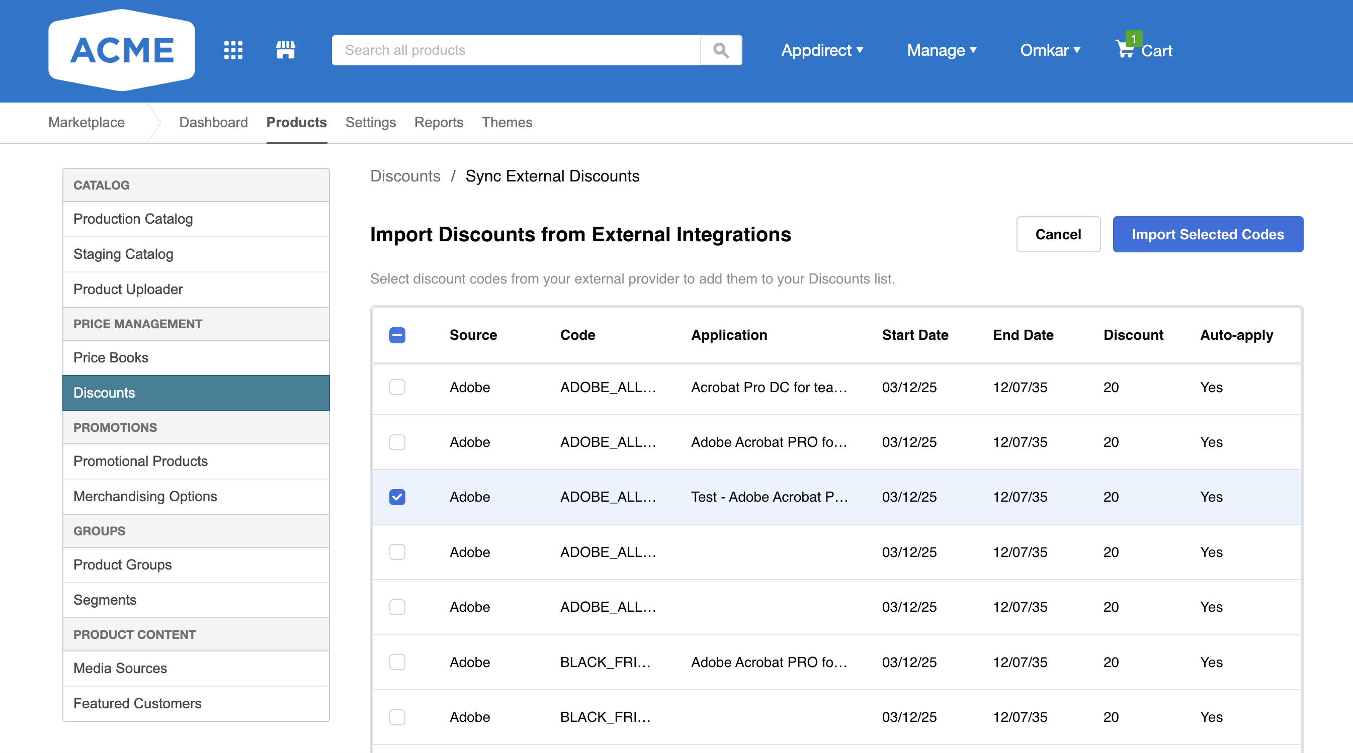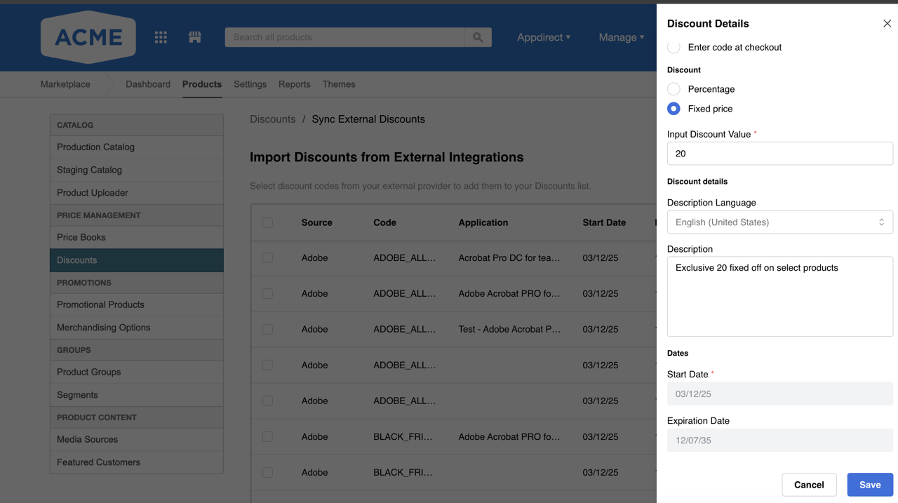 A confirmation message appears and the import process starts automatically. After completion, the imported discounts will appear in the Discounts List page.📝 Note: Currently, Adobe is the only supported external integration. All listed discounts are sourced from Adobe.
